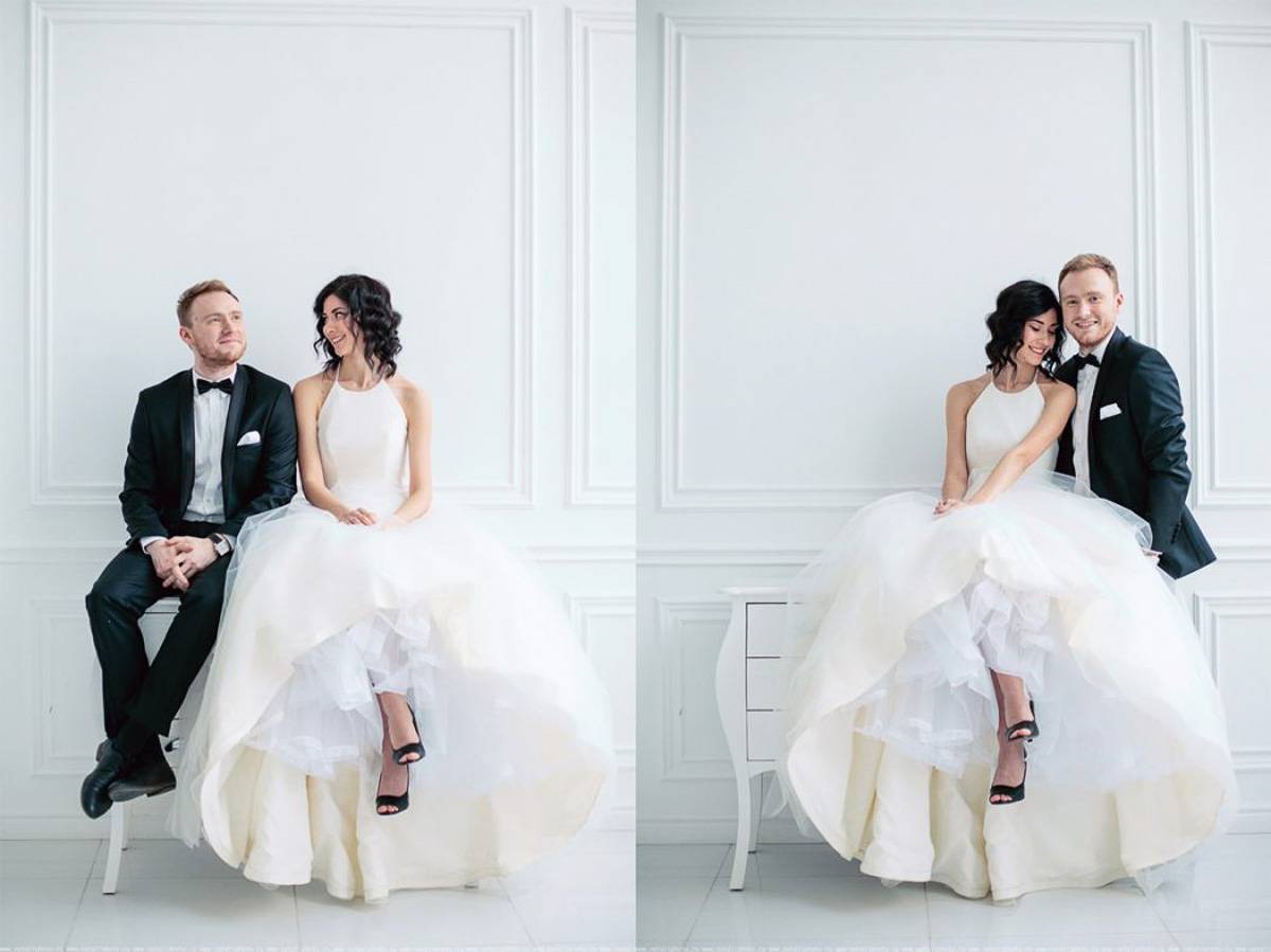 Девушке, желающей быть оригинальной на собственной свадьбе отличным вариантом будет белое платье невесты с нежно-розовой нижней юбкой, придающей особую красоту и шарм наряду. Наши модельеры подскажут, какой фасон и размер платья будет и невесте к лицу, и на фотоснимках выглядеть фотогенично. Все аксессуары невесты и жениха должны соответствовать выбранному образу: серьги с жемчугом, колье или диадема с жемчугом или бриллиантами, белые туфли.