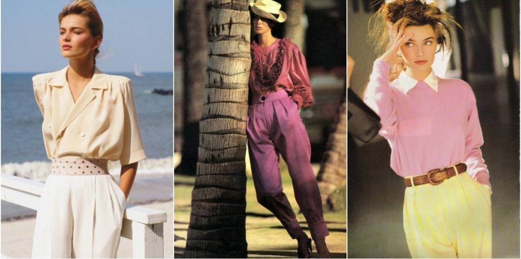 Штаны в 80-х обязательно должны были присутствовать как в мужском, так и в женском гардеробе. Большинство моделей выполнялись из качественного материала, поэтому они служили в течение многих лет. Для пошива брюк использовались необычные фасоны, которые десятилетием ранее были недоступны. На улицах можно было встретить женщин и девушек в самых разных вариантах брюк: