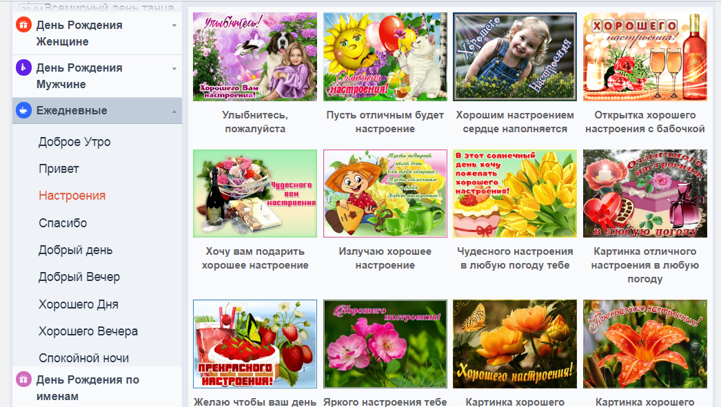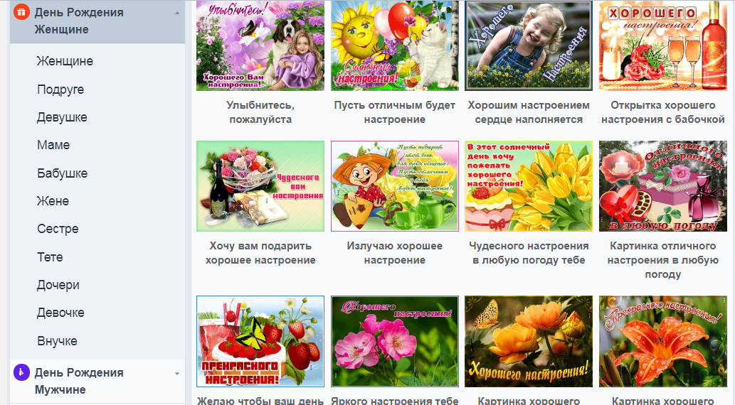 На сайте https://otkritkiok.ru/ находим раздел «Настроение». Здесь вы найдете самые разные варианты открыток с пожеланием «Хорошего настроения», «Не грусти», «Позитивных эмоций» и др.