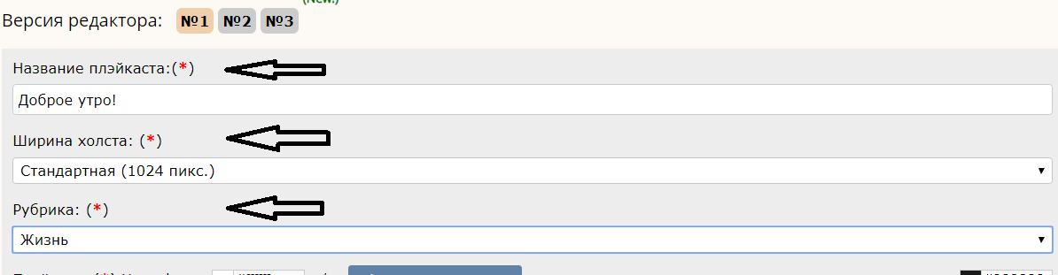 В редакторе пишем название плейкаста, выбираем ширину холста и рубрику.