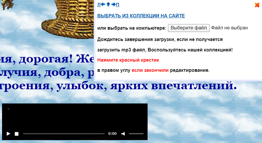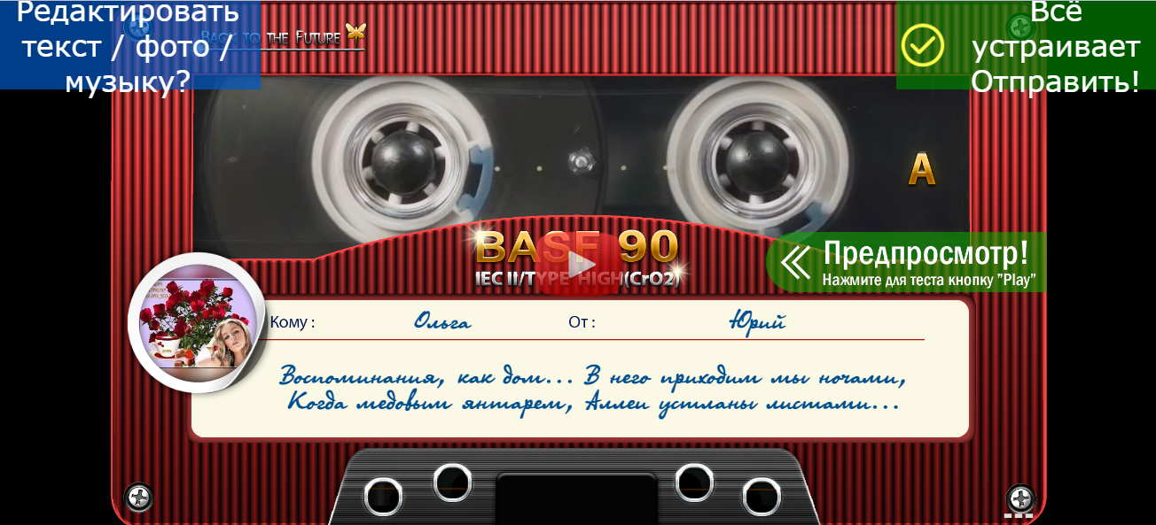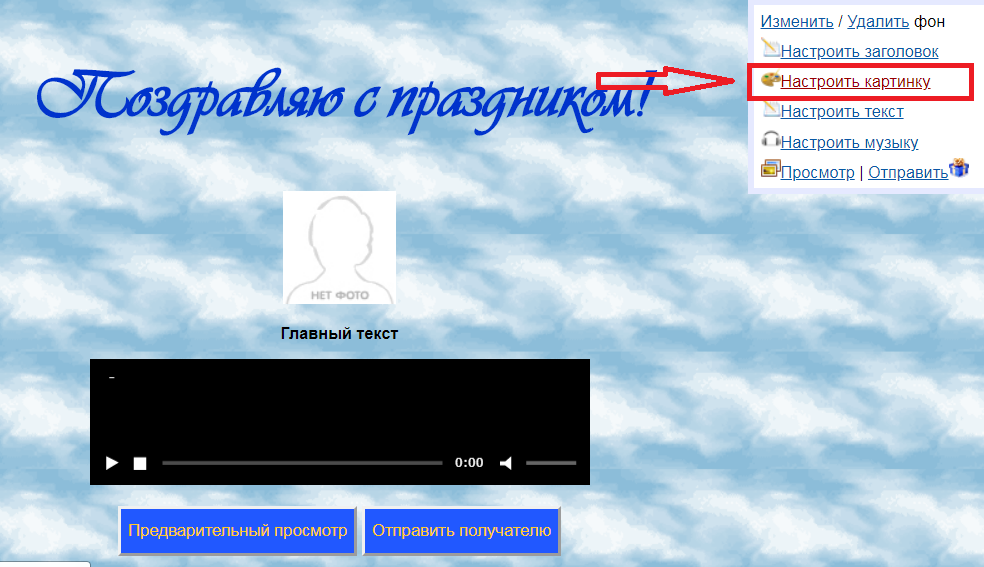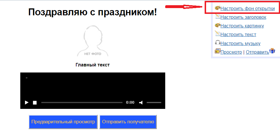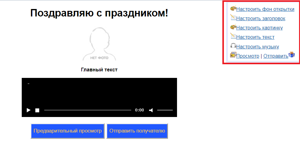 В верхней части экрана находиться аудио трек. Под открыткой есть три варианта, как воспользоваться открыткой.