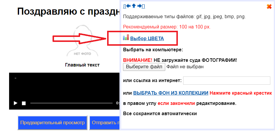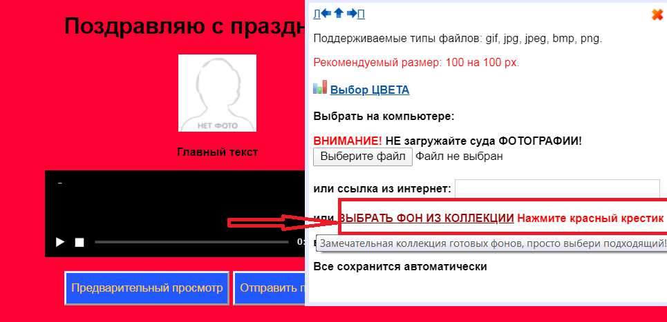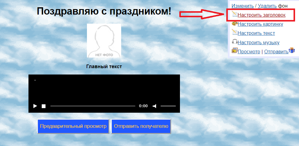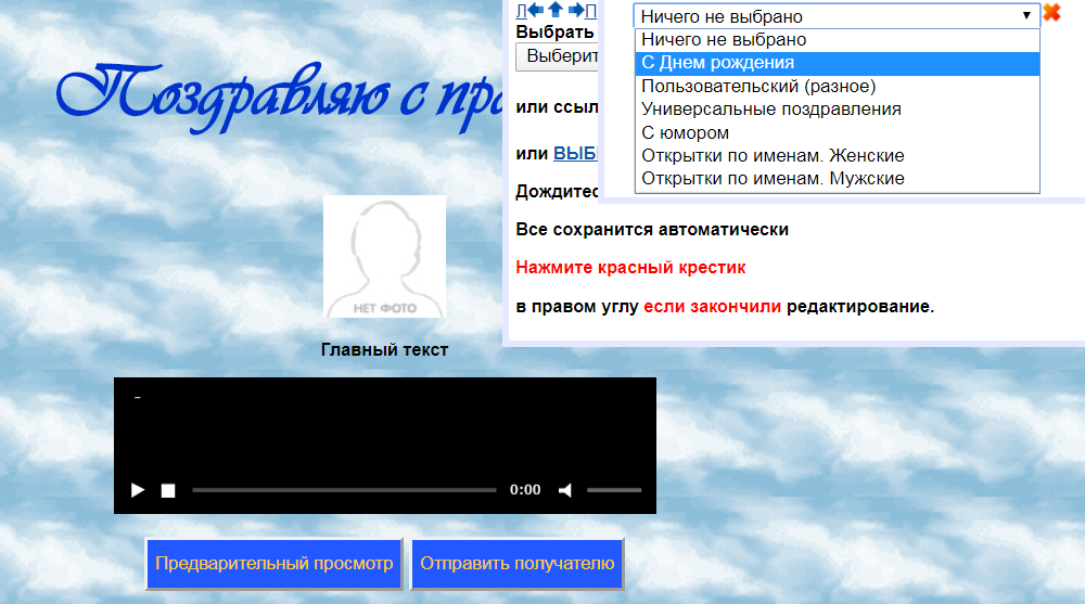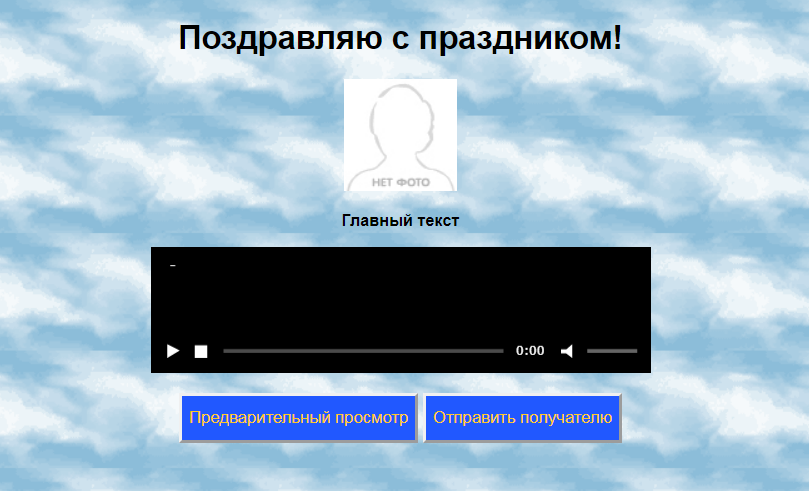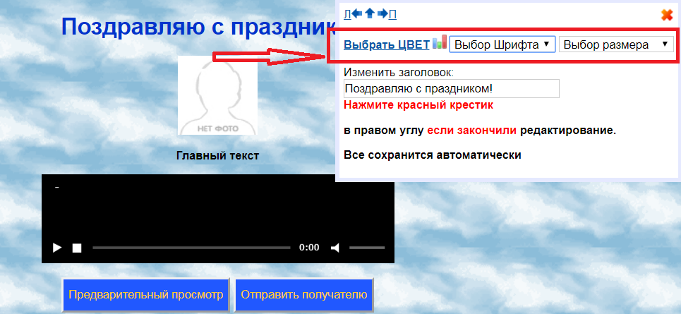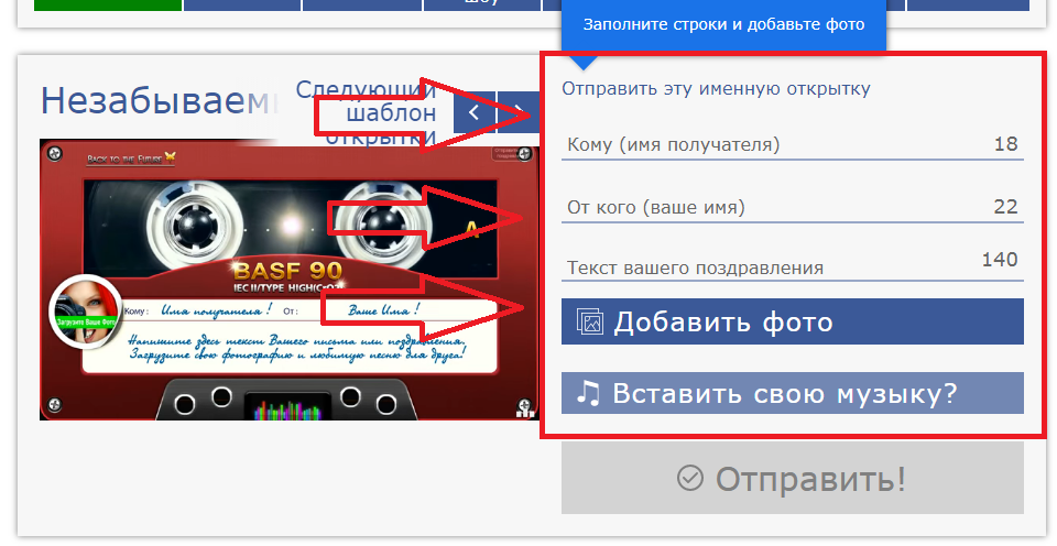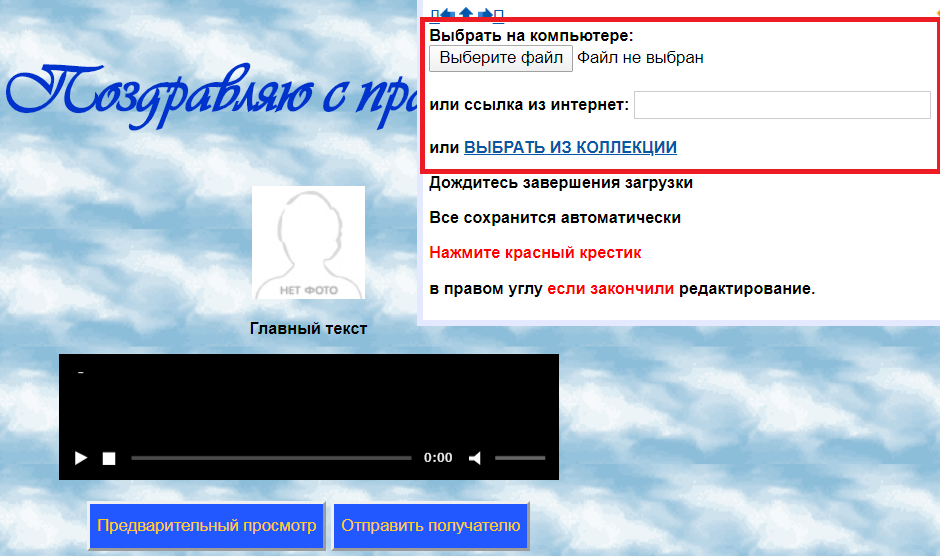 В блоке слева необходимо указать имя получателя и отправителя, текст и фото получателя.