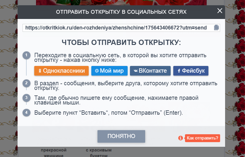 Естественно, после создания чего-то настолько оригинального хочется поделиться этим с миром. Плейкасты, сделанные в приложениях социальных сетей, отправляются простым введением имени адресата в нужную строку. Со сторонними ресурсами всё ещё проще – достаточно просто скопировать ссылку на открытку и отправить её в сообщении нужному человеку. Если же возникло желание поделиться плейкастом с большим количеством пользователей, а копировать и вставлять ссылку много раз не хочется, можно использовать функцию «Поделиться», доступную на подавляющем большинстве сайтов, – она импортирует открытку в выбранную социальную сеть. Для блогов обычно действует способ вставки ссылки в пост.
