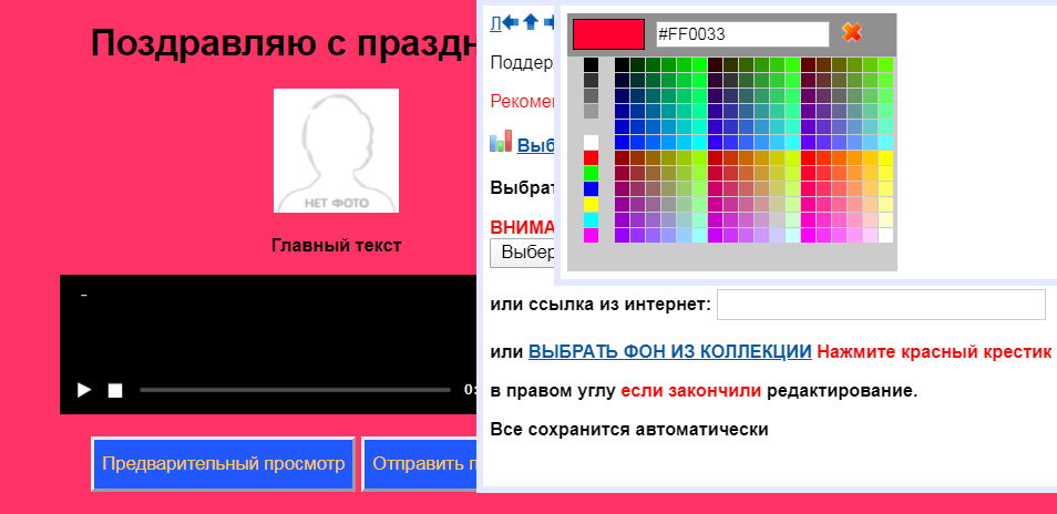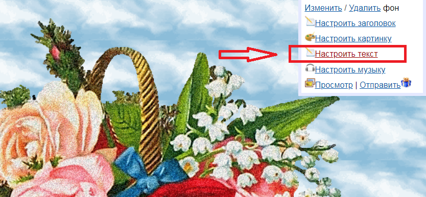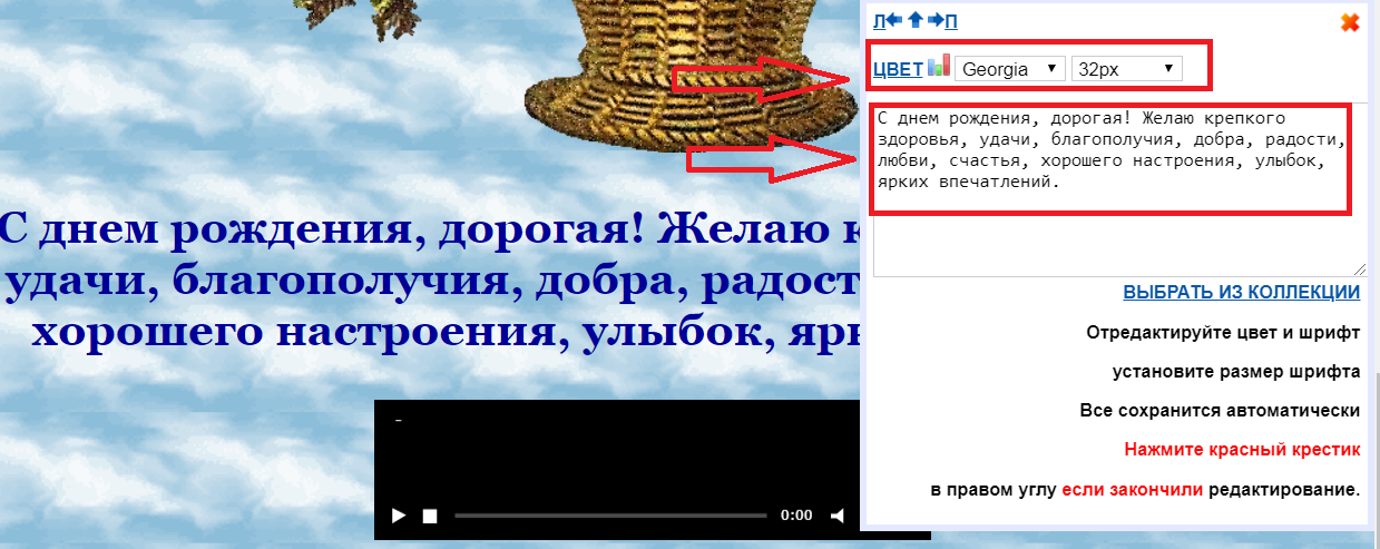 Переходим в «Настроить текст». Настраиваем цвет, стиль и размер текста, в блоке для поздравления пишем текст (свой или с коллекции сайта).