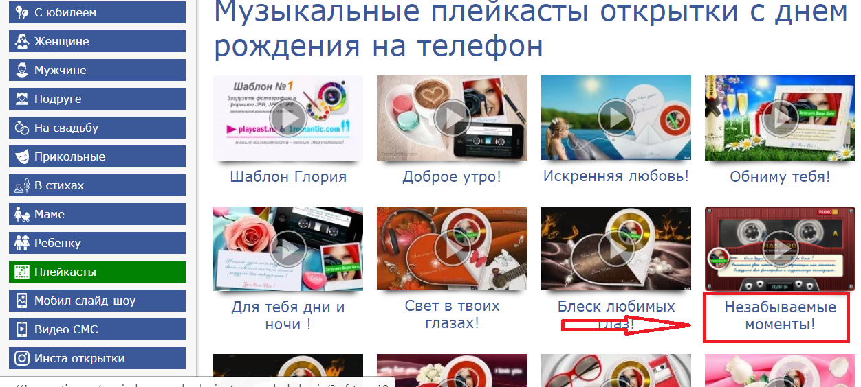 На главной странице находим раздел «Плейкасты». Среди множества предложенных шаблонов, выбираем подходящий, например, «Незабываемые моменты».