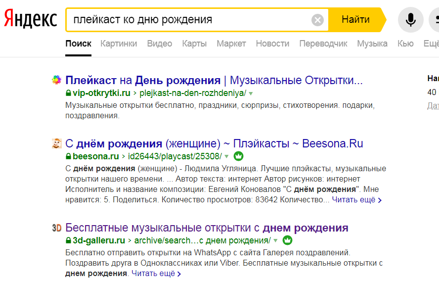 Например, для того чтобы сделать плейкаст «С Днём рождения», нужно, во-первых, выбрать один из множества ресурсов, работающих с онлайн-открытками, во-вторых, следуя инструкциям, найти подходящий фон — обычно в данной ситуации он связан с подарками или сладостями, правильно подобрать песню, которая не только соответствует теме плейкаста, но и понравится виновнику торжества, и в конце написать поздравление или же воспользоваться уже готовыми стихами. Остаётся только скомпоновать всё это в один файл.