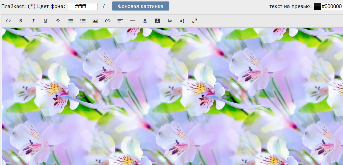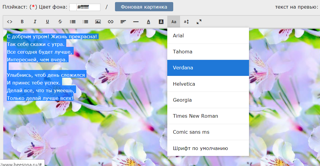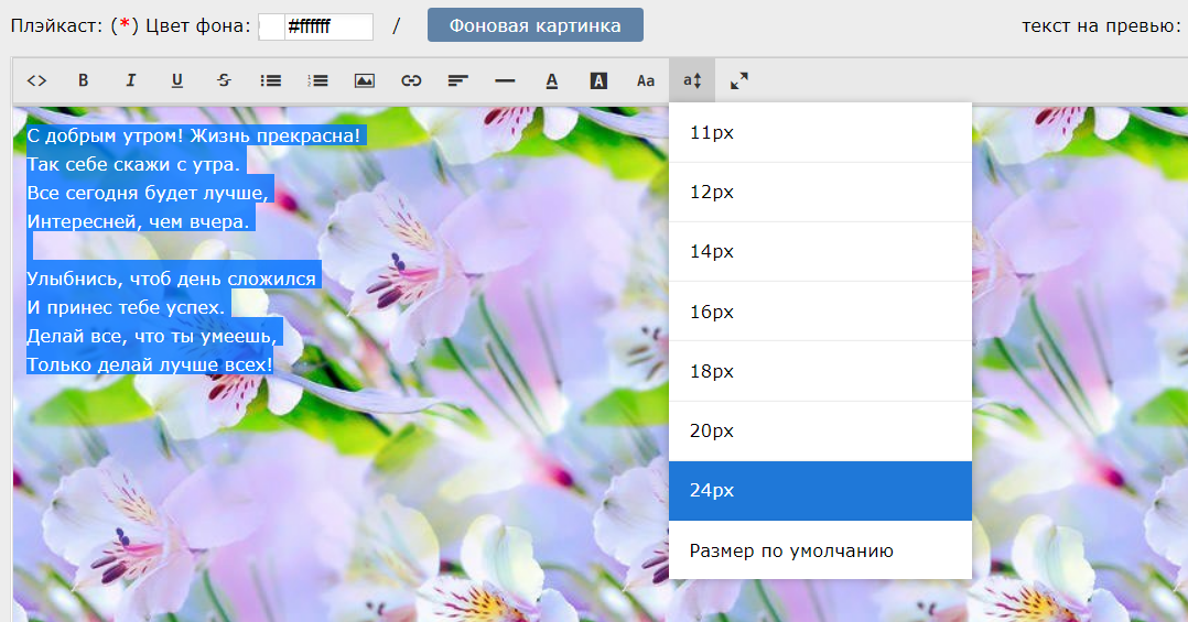 Нажимаем на понравившийся фон, и он автоматические попадет в плейкаст. Набираем подготовленный текст, выбираем шрифт и размер букв.