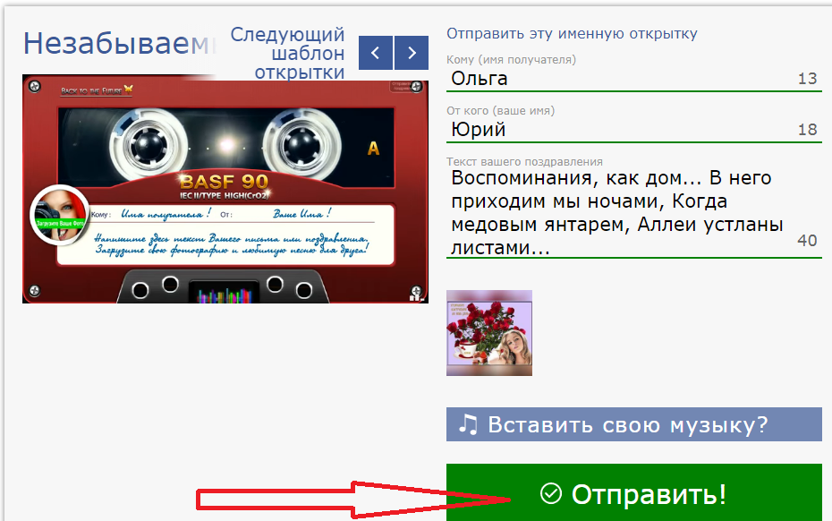 Создать эксклюзивную музыкальную открытку можно на 1romantic.com. Тут вы найдете готовые музыкальные шаблоны. Просто выберите понравившуюся открытку, укажите от кого она и загрузите фото. Затем просто отправьте по нужному адресу. Единственный минус ресурса — платный контент. Одна готовая открытка обойдется примерно от 40 руб. На некоторые плейкасты бывает акция и они предоставляются бесплатно.