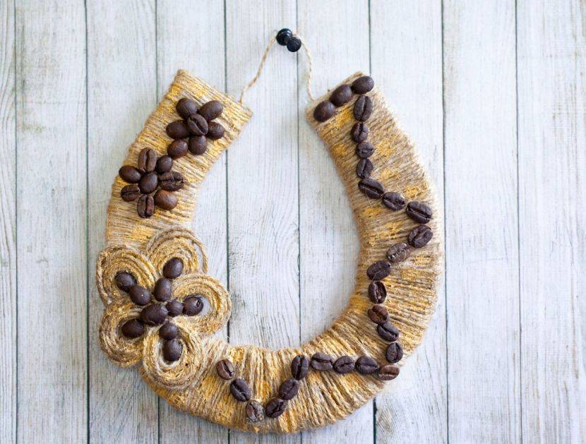 Чтобы не только украсить интерьер, но и наполнить помещение приятным ароматом, можно декорировать основу амулета кофейными зернами. Зернышки для подковки мастерице следует брать обжаренные и зеленые. Крепятся они на тканевую основу изделия с помощью клея. Начинать необходимо с контура подковки.