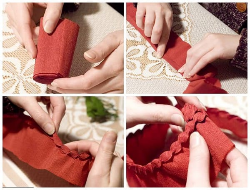Многократно сворачиваем зеленую бумагу, делаем надрезы. Скручиваем ленты по спирали и оборачиваем вокруг проволоки, получаем жгут.
