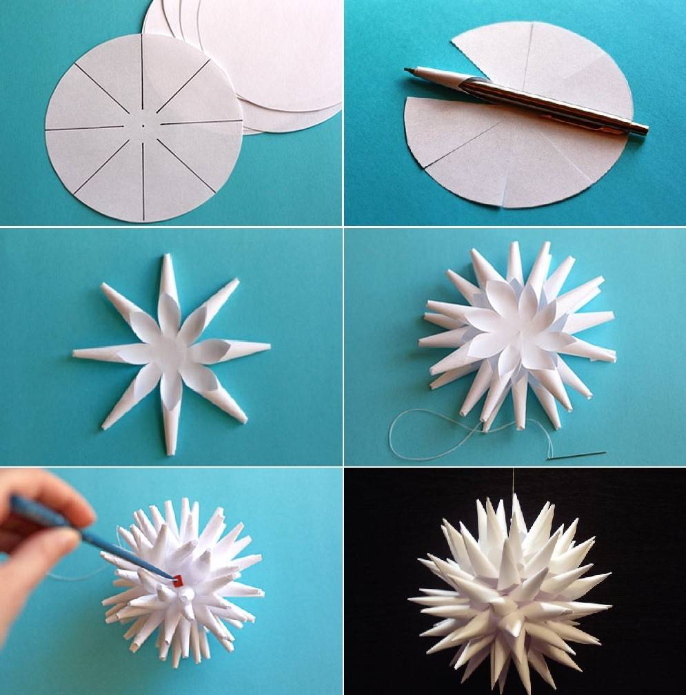 Белые снежинки используют для оформления окон, ими украшают область возле камина. Если протянуть через изделия серебристую нитку, можно развесить в комнате гирлянды из снежинок. Интересно смотрятся новогодние украшения из белой бумаги, когда снежинки разного размера с неодинаковыми узорами. Чтобы выполнить снежинки с объемной серединой, понадобится белая бумага, карандаш, ножницы.