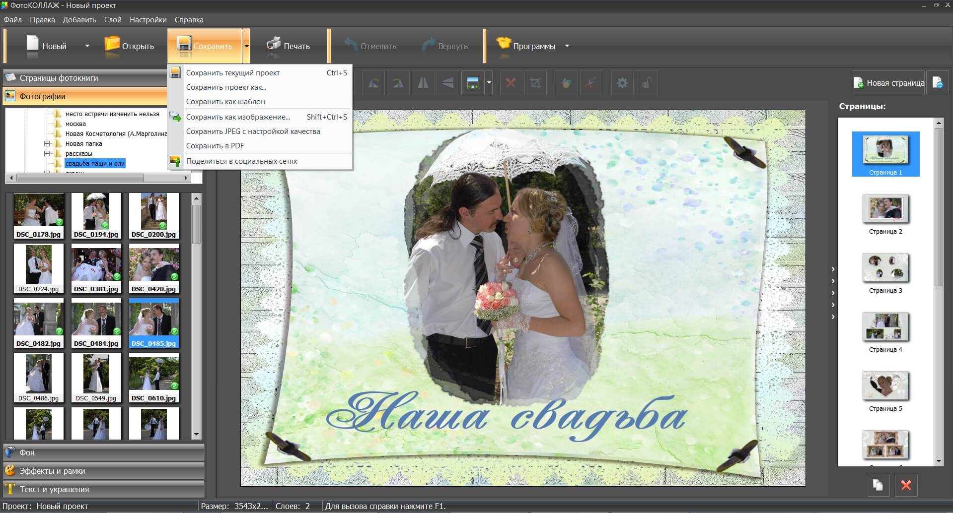 Фотокнига на свадьбу готова. Теперь можно сохранить ее на компьютере или сразу же распечатать. Вам доступен выбор: сохранить коллаж как проект и позже вернуться, чтобы отредактировать, либо как изображение или шаблон.