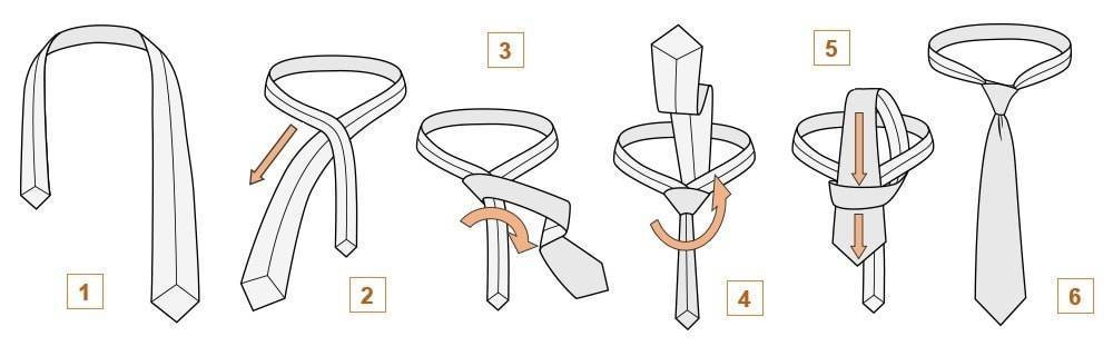 Вообще это один из самых популярных вариантов завязывать галстук в среде мужской братии. На картинке выше вы можете увидеть, как завязать галстук таким узлом пошагово. Это простой способ, который подходит для любого события, в том числе, для походов на работу в офис.