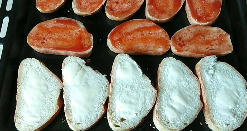 - Смажьте кусочки хлеба кетчупом.