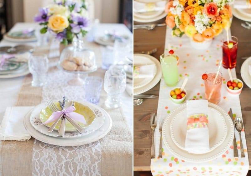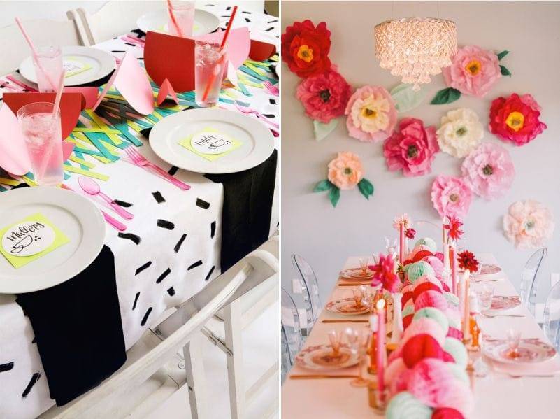 - Как правило, тематические вечеринки не требуют дорогого декора, вы вполне можете задекорировать базовый набор аксессуаров и многое сделать своими руками. Так, на классическую белую скатерть можно постелить дорожки из ткани в нужной расцветке.