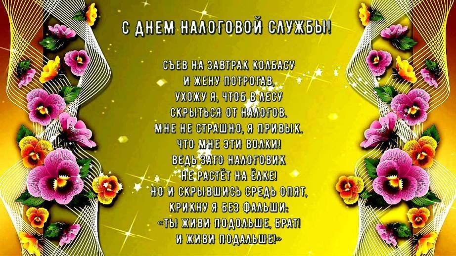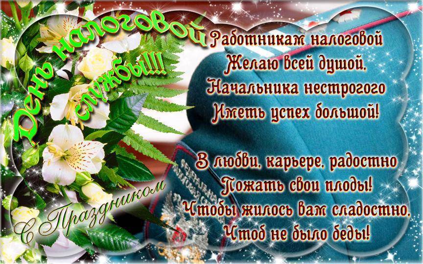 Всех, кто в налоговой трудится службе,Поздравить хотим в этот радостный день,Праздник пусть полон лишь смеха и дружбы,В душе блещет солнце, невидима тень!