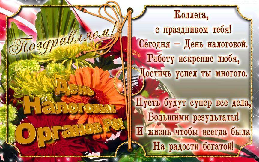 Кто с налогами работает,Его сегодня поздравляем!Желаем радости и света,Большой любви ему желаем!