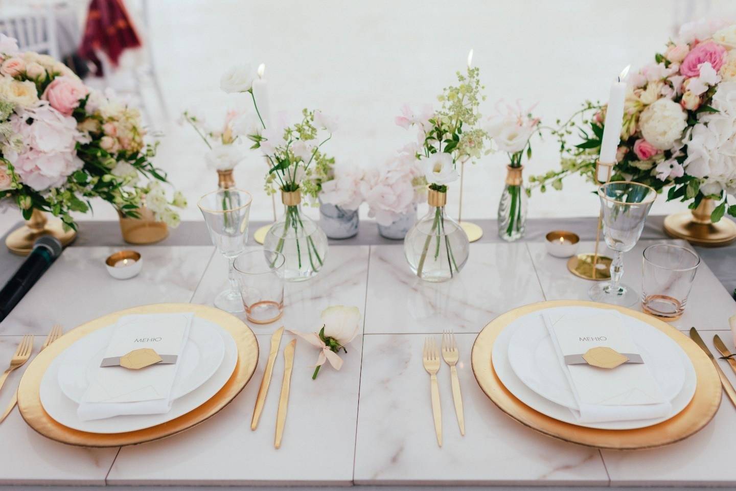 Центральные композиции являются ключевым украшением столов. Они не обязательно должны быть слишком экстравагантными — при правильной организации даже полевые цветы в стеклянных вазах будут смотреться оригинально.