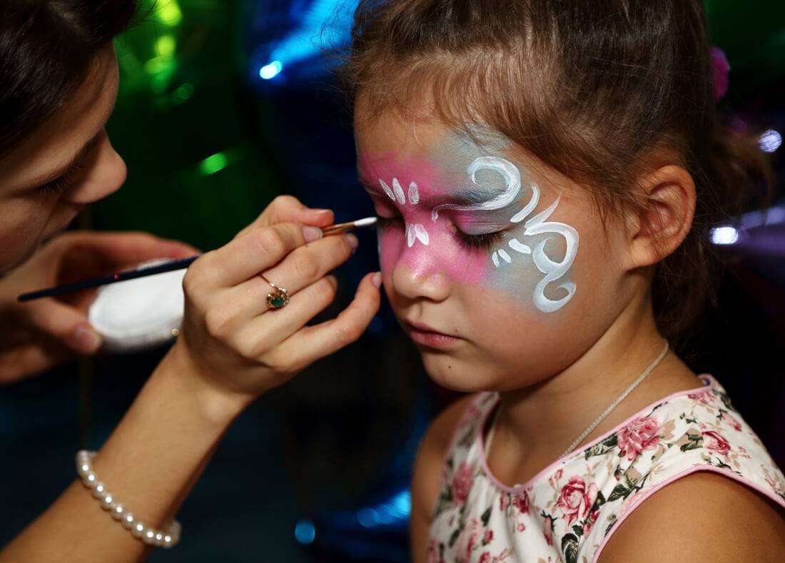 - Аквагрим. Технологичный и безопасный метод. Краски на водной основе абсолютно безвредны для детской кожи. Даже если ребенок забудется и съест краску, с ним ничего не случится.