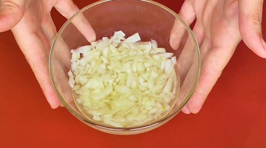 - Начните с лука. Очистите головку. Помойте в холодной воде. Нарежьте тонкими кружками. Сложите в миску. Добавьте винный уксус и соевый соус. Перемешайте. Оставьте на 10-15 минут. Потом отожмите лук от маринада.