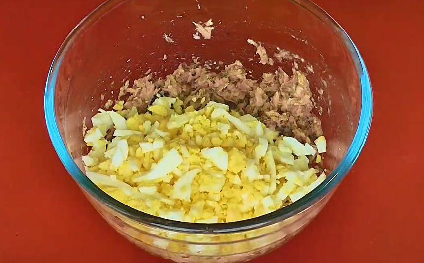 Далее – слой из яиц. Их надо натереть на тёрке, смешать с солью и чёрным перцем, всё смешать и выложить по чайной ложке на каждый кусочек.