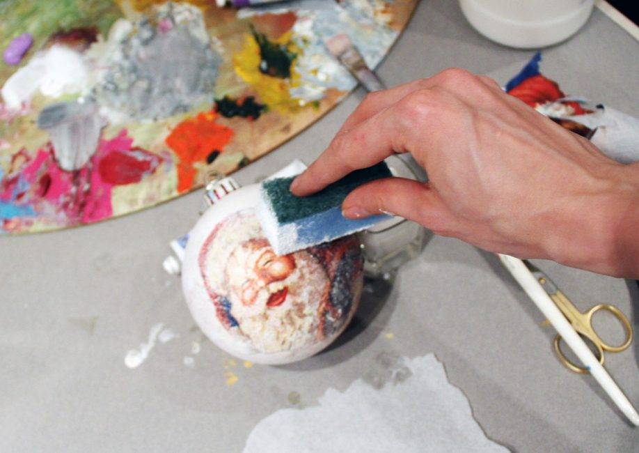 - Когда заготовки высохнут, начните соединять их формируя шар. Пока все высыхает, подготовьте дождик, нарежьте его мелкими кусками. Каждую деталь смазываем клеем и помещаем внутри шара.