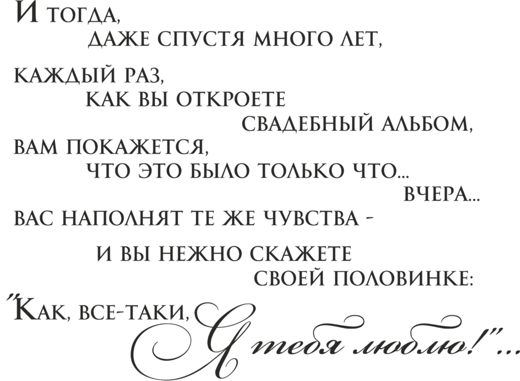У кого-то свадьба уже была (может быть даже не одна), а у кого-то нет; кто-то предпочитает пышное и шумное веселье, а кому-то ближе тихий праздничный ужин в кругу близких; некоторые предпочитают выездную регистрацию брака, а некоторые идут в ближайший районный ЗАГС. У всех разные вкусы, разные бракосочетания и, конечно, разные цитаты про свадьбу, которые они любят.