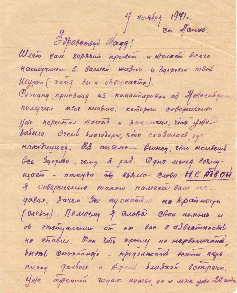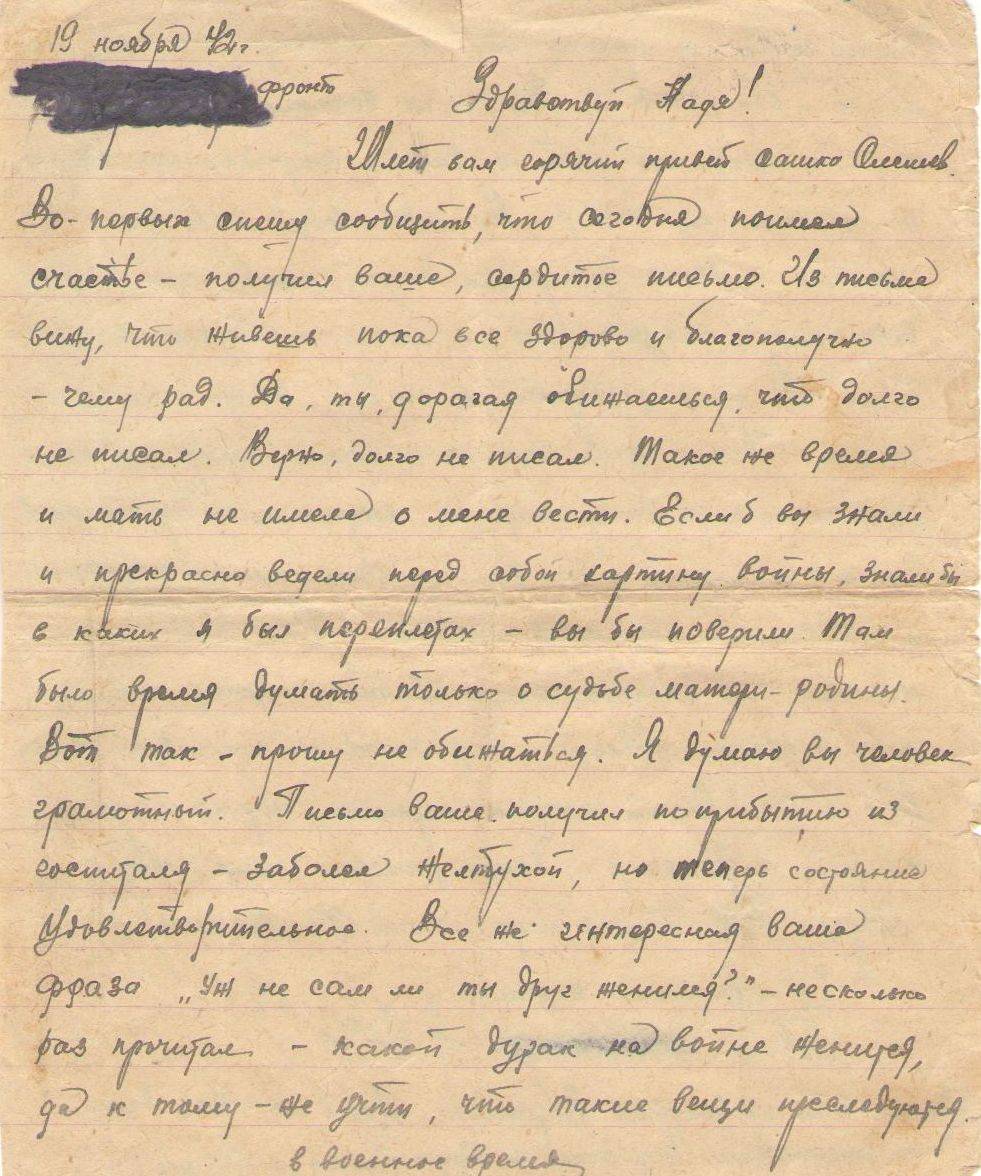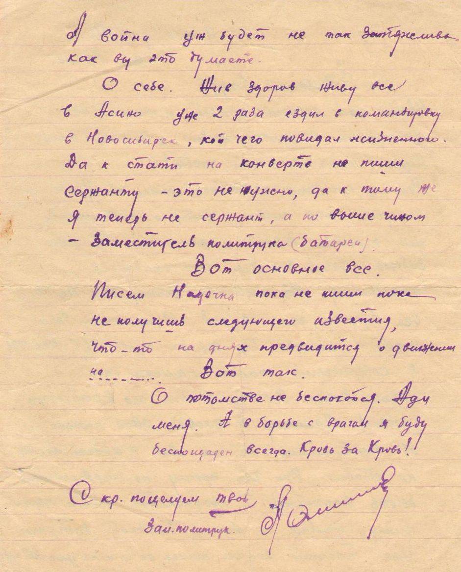 «Писем, Наденька, пока не пиши, что-то на днях предвидится о движении на фронт. Жди меня. А в борьбе с врагом я буду беспощаден всегда. Кровь за кровь!»
