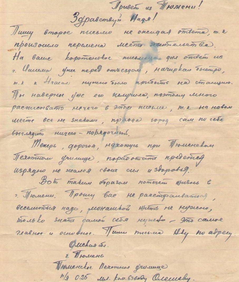 В 1939 году он начал учебу в пехотном военном училище в г. Тюмень, и в далекую архангельскую деревню полетели письма, полные грусти по дому и любимой девушке.