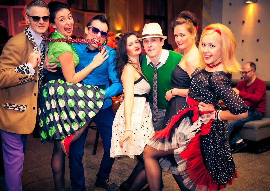 Мужчины могут надеть свободные штаны яркого цвета. Подойдут и узкие брюки по косточку. Образ не будет цельным без цветастого галстука или шляпы! Дамам можно выбрать пышную юбку, подчеркивающую талию, и стильные лаковые лодочки.