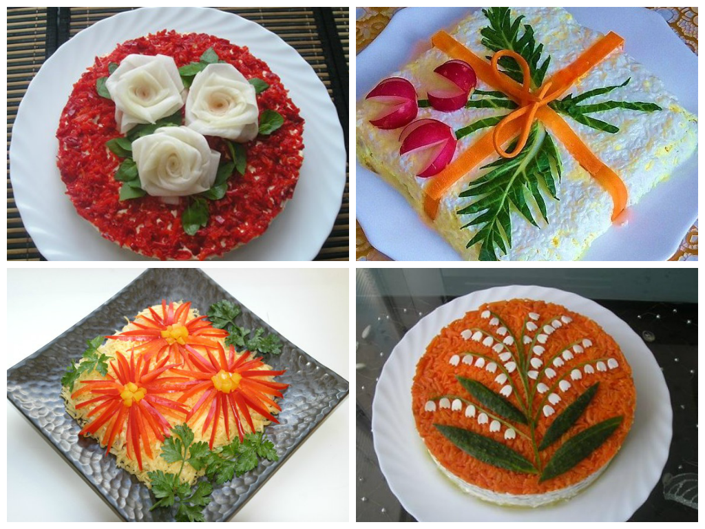 Украшаем блюдо ажурными элементами. Для оформления праздничных салатов и холодных закусок делаем цветы, бабочки, завитушки из различных овощей и фруктов. Можно нарисовать кружевной узор при помощи любого светлого соуса.