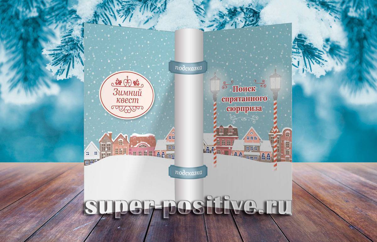 Оригинально начать квест-игру можно с помощью специальной открытки. Она устойчивая и готовится всего несколько минут (подробности в комплекте), в середине — первая подсказка; формат открытки — А4. В готовом виде она выглядит таким образом: