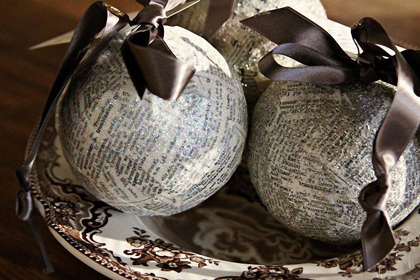 Если в доме скопилось много старых газет, то их можно переработать в новогодний шар. Для этого надо сделать трубочки и наматывать на карандаш (или ручку). Каждый слой обязательно проклеивается. В конце раскрашиваем из баллончика. Готово!