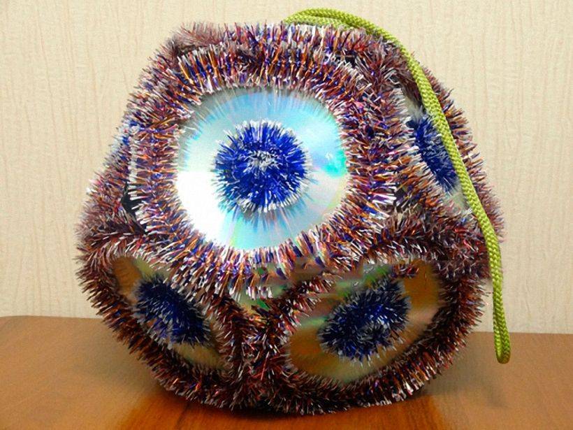 Вначале рекомендуется вырезать трафарет пятиугольника, желательно из картона. Потом по трафарету поставить пять точек на диске. Шилом или дрелью сделать отверстия в отмеченных точках. Соединить диски проволокой. Должен в итоге получиться шар, который надо украсить мишурой.