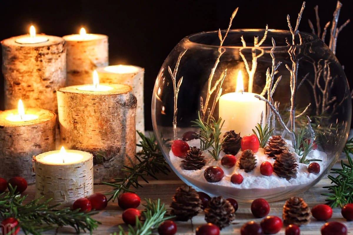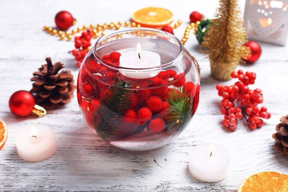 Украсят новогодний стол композиции с плавающими свечками. Прозрачные сосуды любой формы наполняют яркими ягодами, кружочками цитрусов, ветками, листьями, шишками. Вливают воду и помещают специальные плавающие свечи.