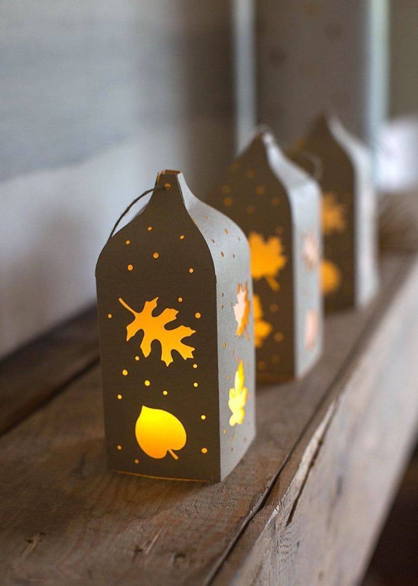 Для самостоятельного изготовления очаровательного светильника берут обычную стеклянную банку. Выкраивают из бумаги любого цвета и текстуры ленту, которую можно обернуть с напуском вокруг емкости. Рисуют и вырезают несложный пейзаж — городской, сельский, лесной. Крепят его в нижнем секторе сосуда. Остается поставить внутрь свечу и зажечь ее.