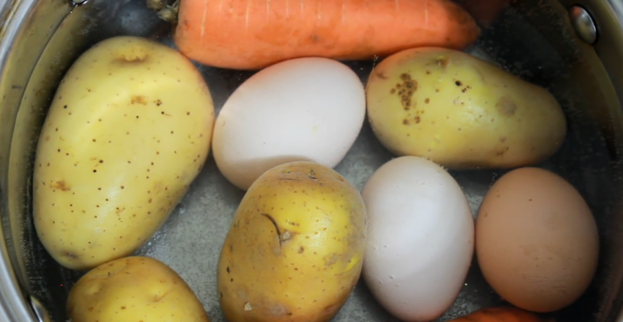 1) За несколько часов до начала сбора салата, отварите необходимые ингредиенты до готовности. Если дома имеется балкон или лоджия, остудите продукты приоткрыв окно. Морозная погода ускорит охлаждение, позволив скорее приступить к готовке.