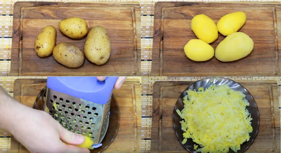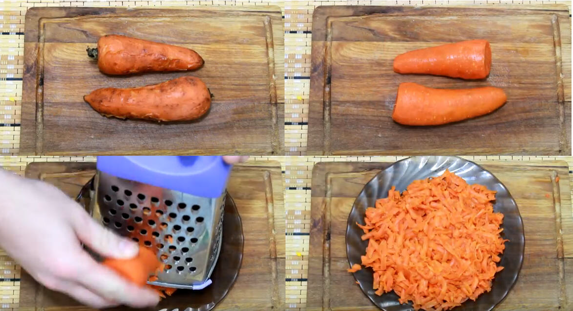 Подготовка ингредиентов: все, кроме сельди и лука измельчается на крупной терке.