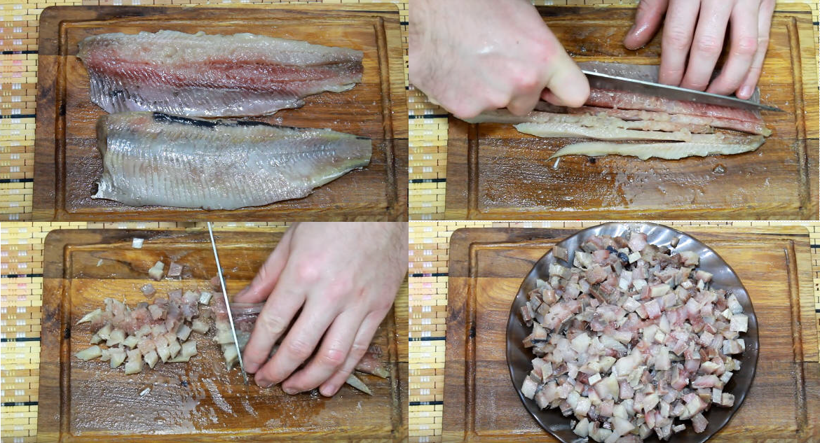 1. Начнем с разделки селедки. Если она у вас в виде пресерв и уже кусочками, то вам останется только проверить, что в ней не осталось косточек. А с цельной рыбой придется повозиться.