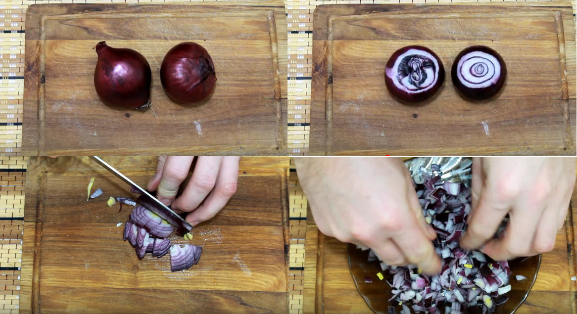 6. Очищенную головку лука меленько крошим и обдаем кипятком. Если взять сорт этого овоща с красным или фиолетовым оттенком, то есть вероятность, что нарезка репчатого красавца будет менее «острая» и не надо будет ничего предпринимать для устранения излишней горечи.