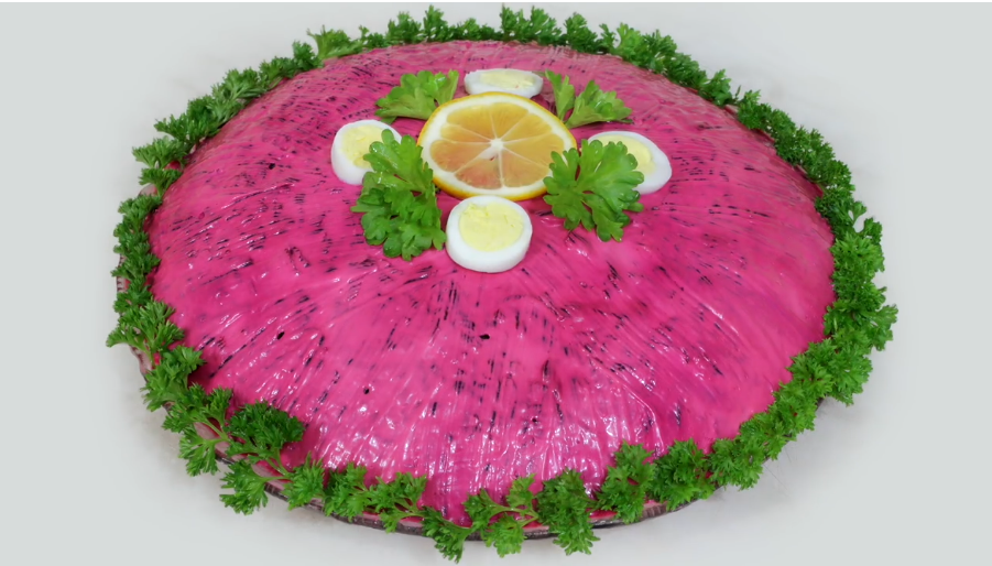 5) В качестве верхушки, используйте остаток свеклы, что остался. Распределяйте ингредиент так, как будто «шубка» покрывает не только макушку, но и боковые стороны.