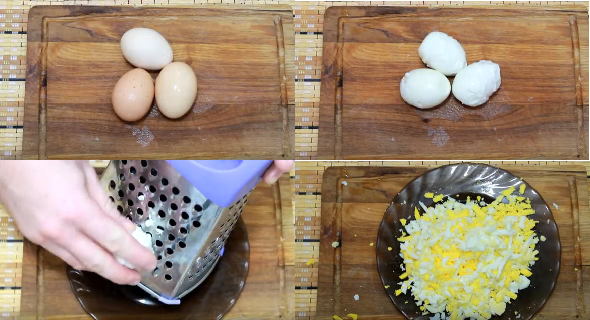 3. Заранее отваренные и охлажденные до комнатной температуры овощи и яйца очищаем от внешних несъедобных шкурок. Не теряя времени, при помощи терки превращаем очищенные компоненты в нежную стружку, обязательно распределяя ее в разные емкости. В каждый измельченный ингредиент добавляем по несколько ложек майонезно-желейного «закрепителя» и перемешиваем.