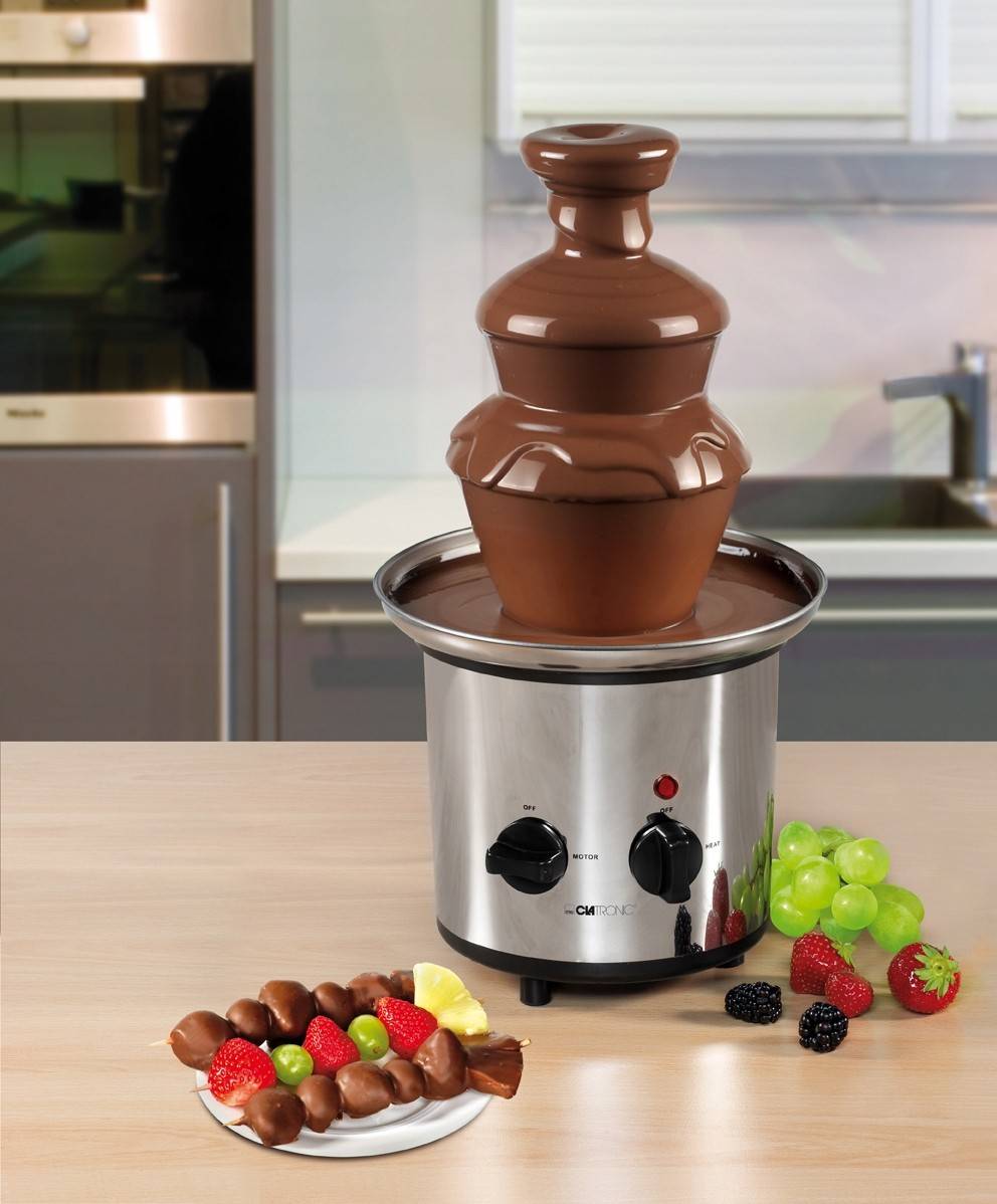 По виду шоколадный фонтан похож на обыкновенный, из которого вместо воды начал вытекать шоколад. Но по конструкции он отличается, ведь шоколад должен разогреваться до 40 градусов. Поэтому, под нижней чашей фонтана располагается специальное устройство термо-нагрева, которое должно постоянно работать, нагревая и растапливая шоколад. Растопленный шоколад поднимается к верхней чаше, переполняет ее и плавными потоками спадает к нижней. В нижней чаше он не успевает застыть, поскольку снова разогревается и поступает в верхнюю чашу.