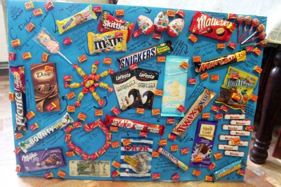 Плакат с шоколадками дарят на день рождения мужу, подруге, маме, бабушке и любому родственнику. Такая большая открытка выглядит ка.
