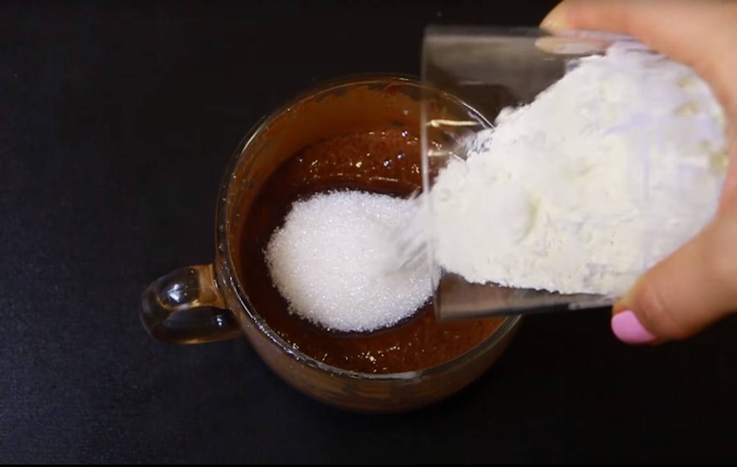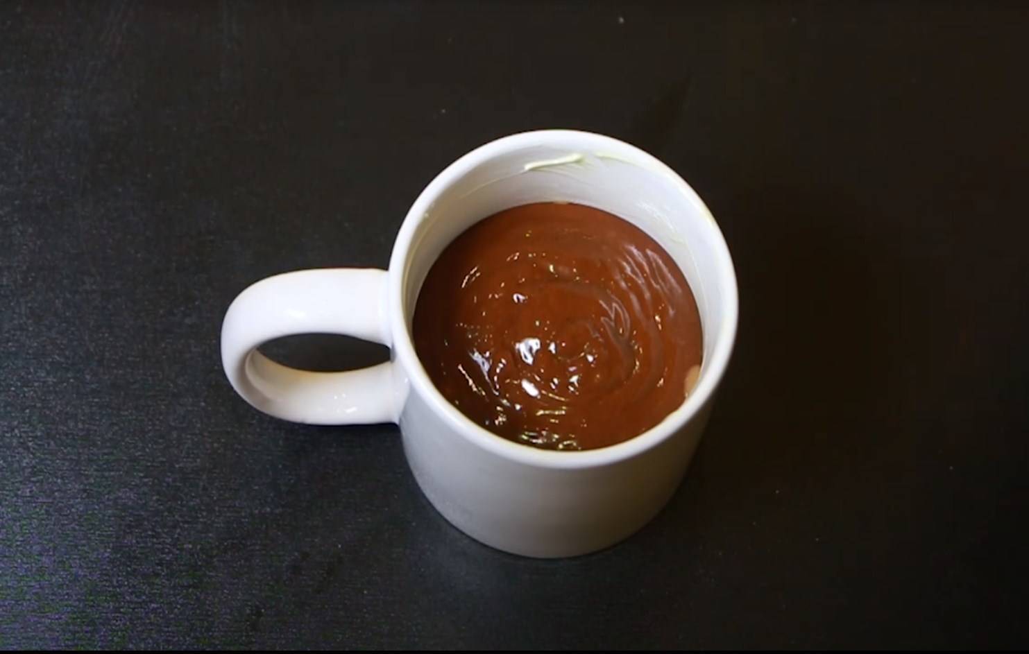 Выливаем шоколадную массу в подготовленную кружку. Заполняя емкость для выпекания не более, чем на половину. Выпекаем в микроволновке в течение 2-3 минут при мощности в 600 Вт.