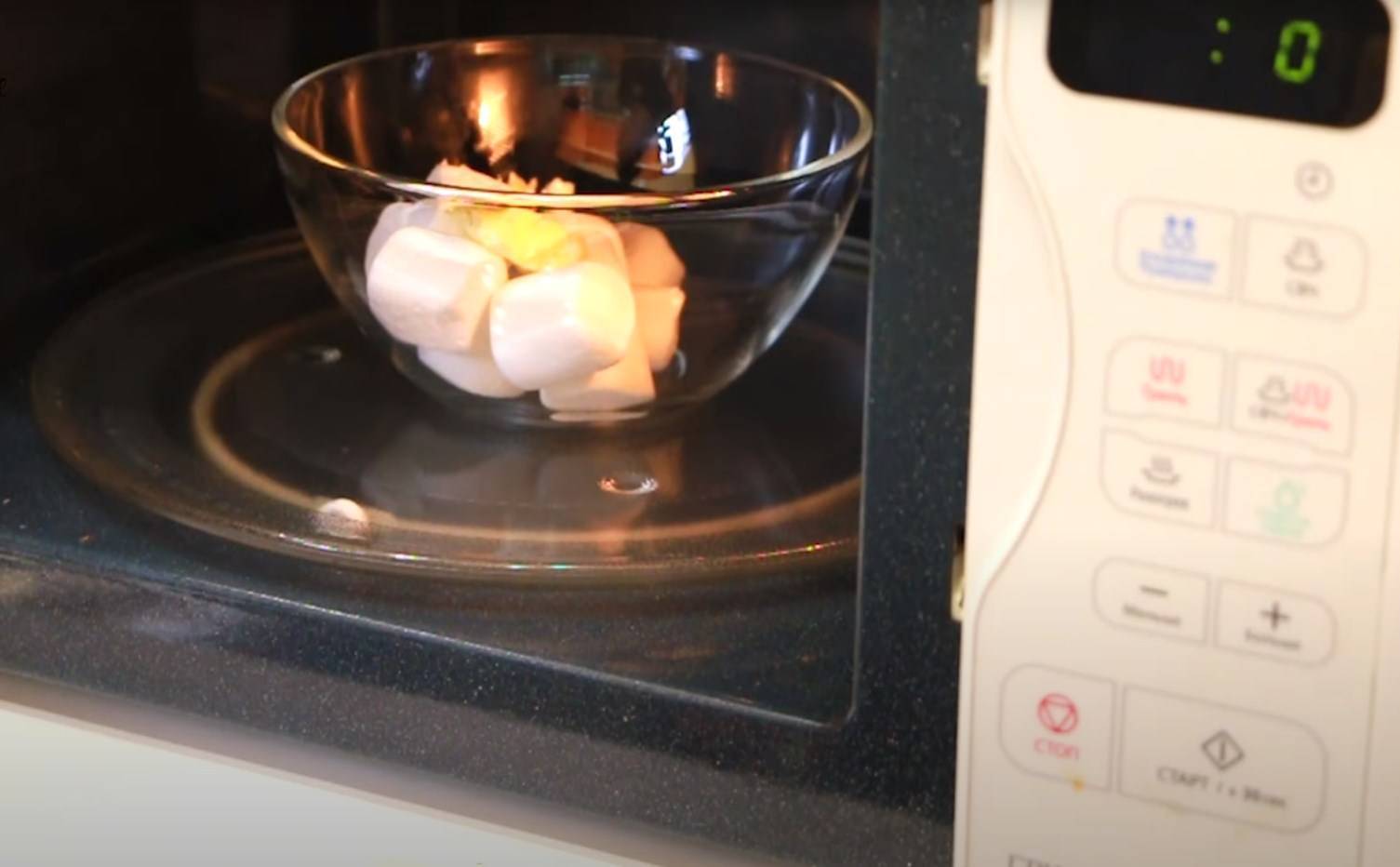 Сливки переливаем в глубокую емкость и отправляем в микроволновку на 30 секунд, чтобы сливки почти закипели.