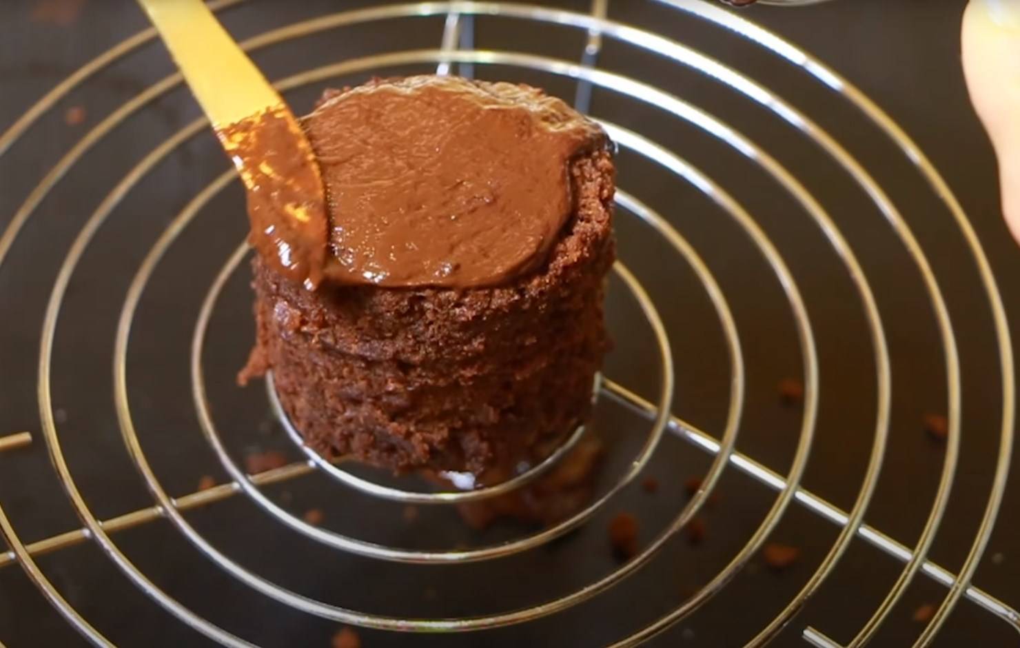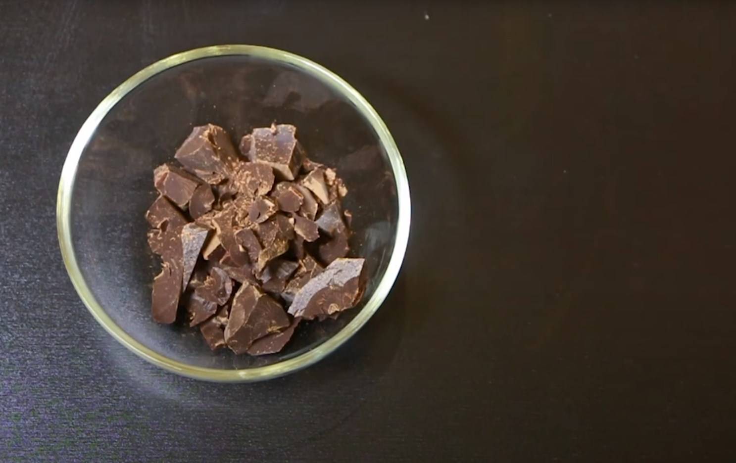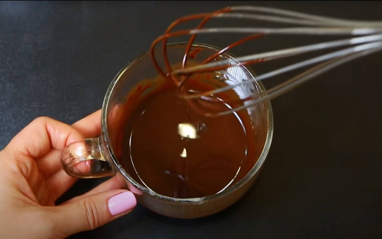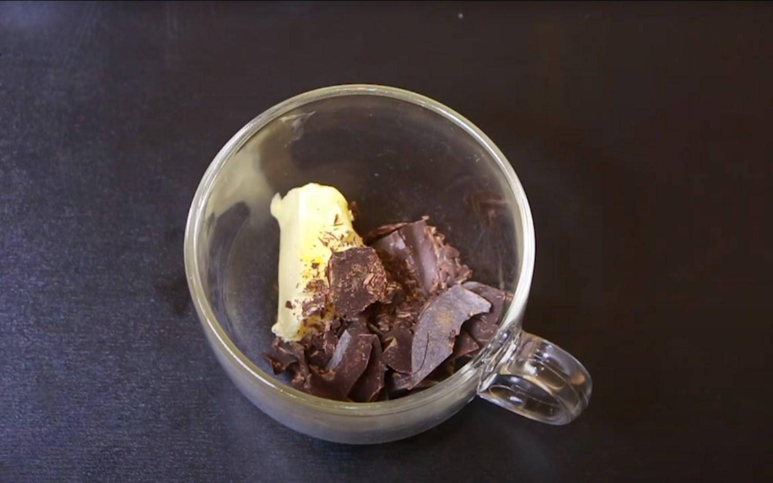 В другой кружке перемешиваем масло и измельченный темный шоколад. Греем в микроволновке в течение 10-20 секунд до растворения сливочного масла.