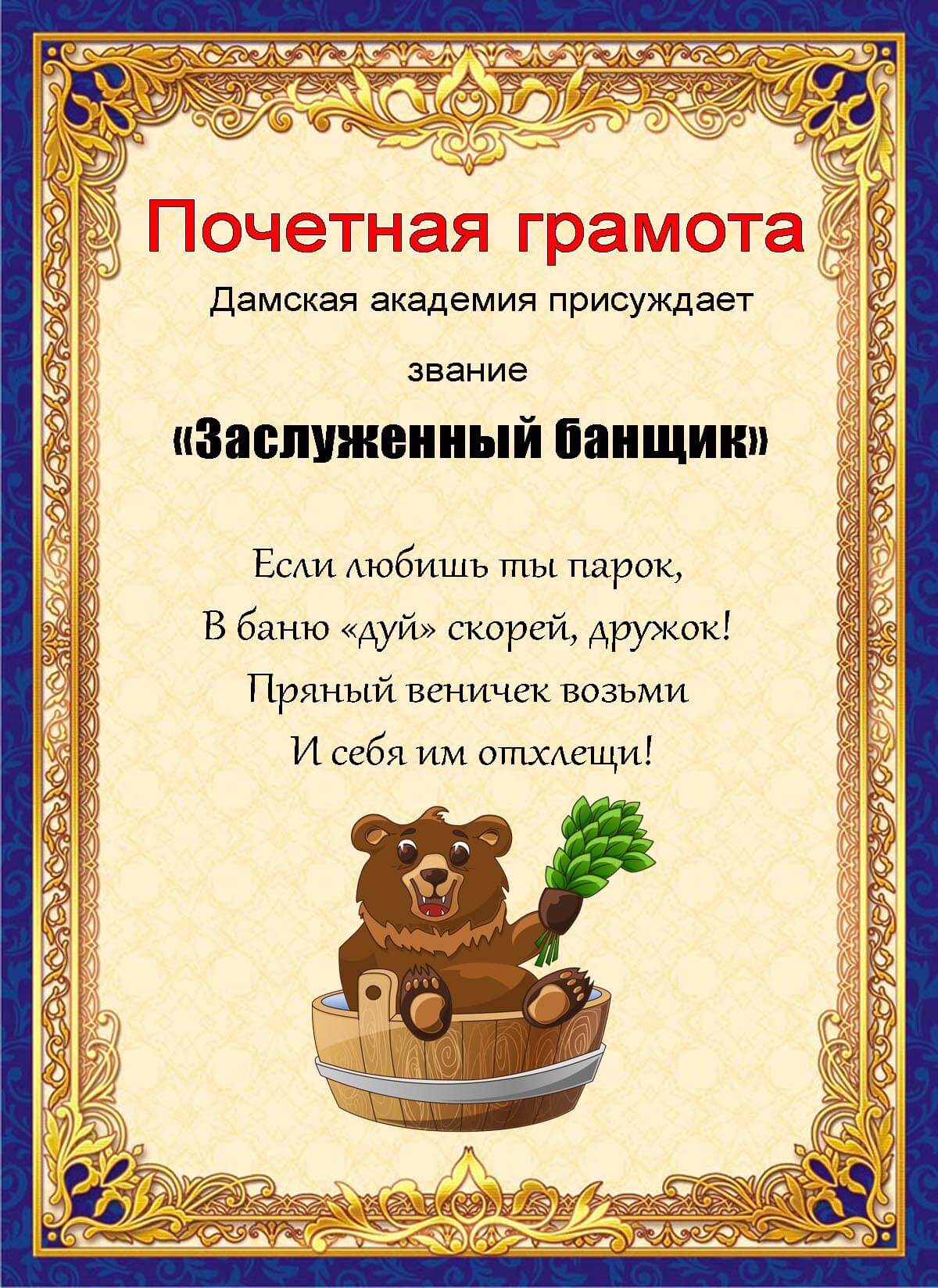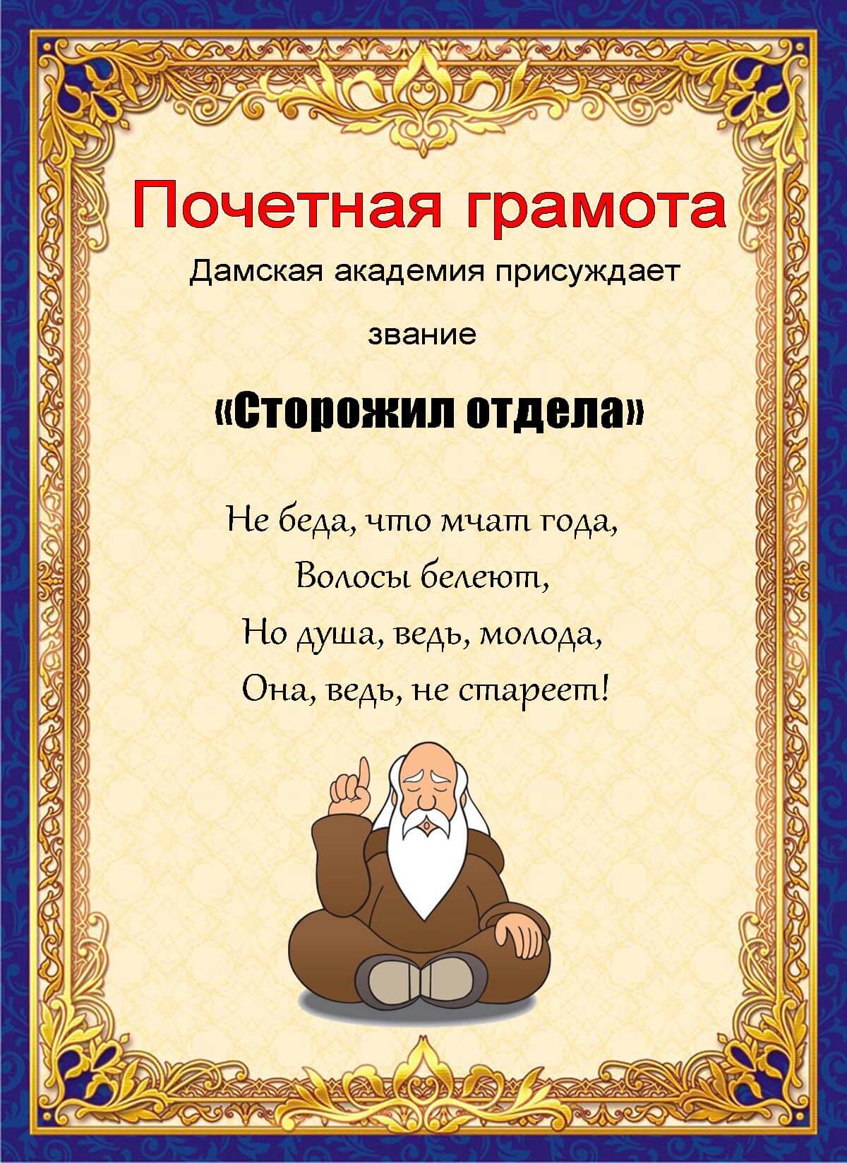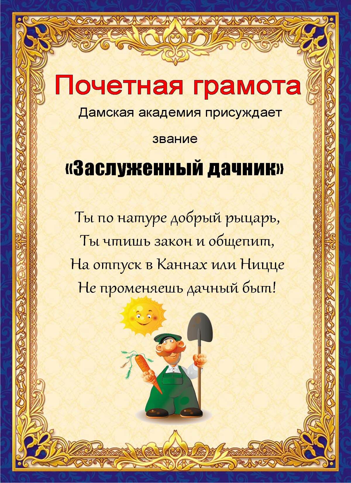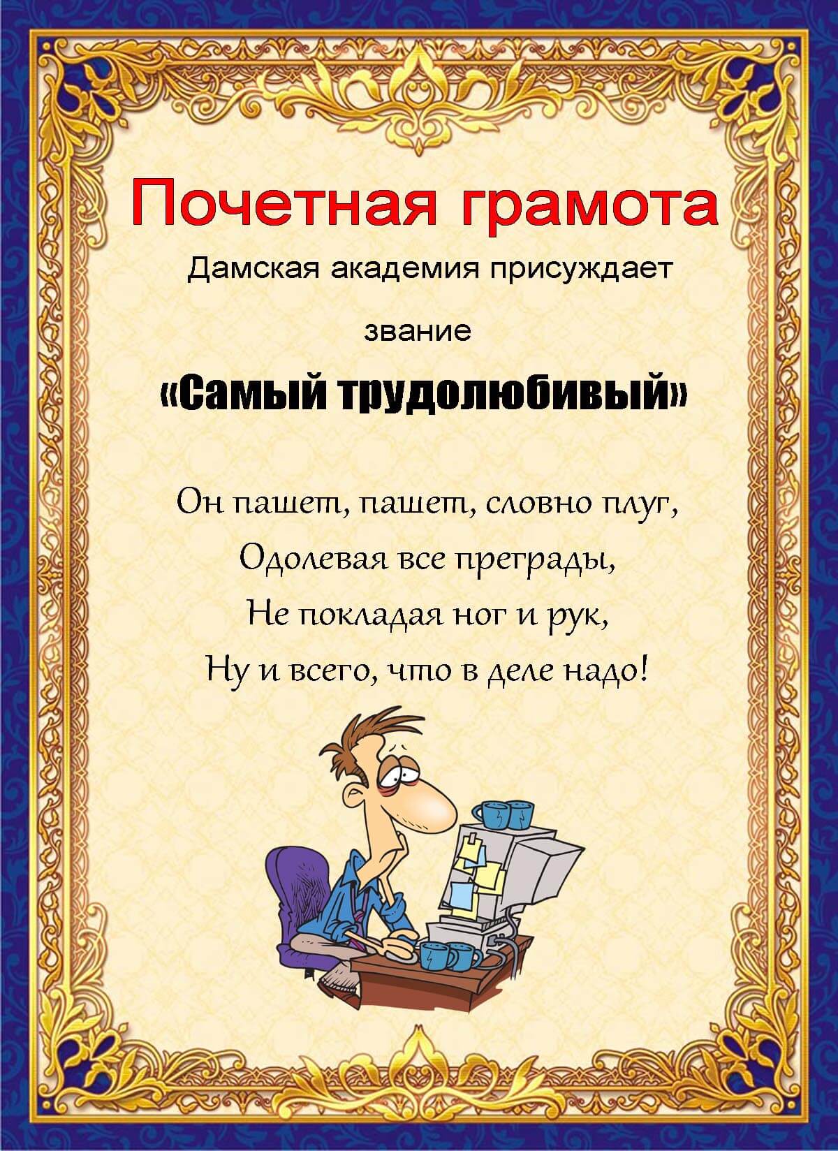 Свои будни тоже можно раскрасить шутливыми вручениями коллегам и друзьям подобных грамот с соответствующим текстом. Я вношу надписи, фото, распечатываю на цветном принтере и вручаю при любом удобном случае. Можно взять за основу какой-то шаблон, написать все, что нужно, и оправить по электронке! В любом случае такие мини-события остаются в памяти надолго.