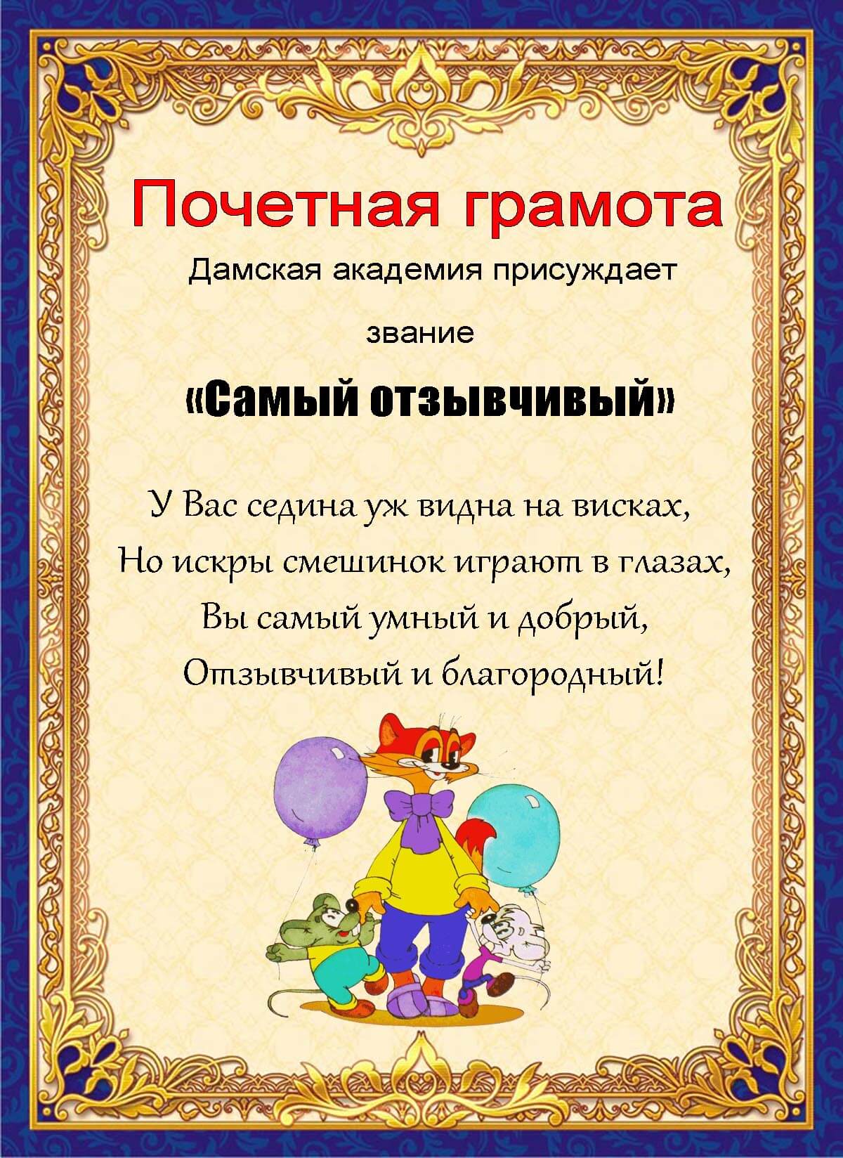 Очень часто применяю такие шаблоны для вручения близким на домашних праздниках. Благодарим всех и за все. День рождения у тети — ей поздравление, а дяде — благодарность за правильный уход, поскольку только в любви и согласии можно так долго жить вместе.