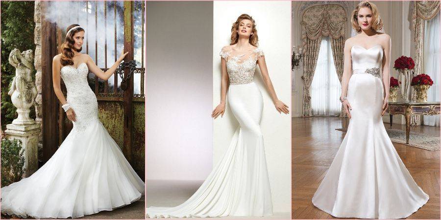 - Девушки небольшого роста, но с правильными пропорциями, могут позволить себе свадебное платье рыбка. В этом случае визуально добавить сантиметров можно, надев каблуки и выбрав модель с открытым декольте. От длинного шлейфа лучше отказаться.